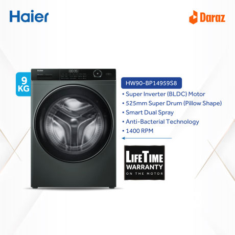 হায়ার ৯ কেজি ফ্রন্ট লোডিং ওয়াশিং মেশিন/৫২৫ ড্রাম/স্টিম ওয়াশ/বিএলডিসি মোটর (HW90-BP12357S8)