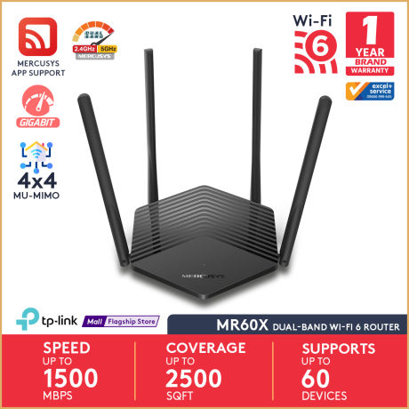 Mercusys mr60x ax1500 wifi 6 রাউটার ডুয়েল ব্যান্ড 1500 mbps ওয়্যারলেস 1.5 gbps গিগাবিট ওয়াই-ফাই ofdma এবং বিমফর্মিং সহ MU-MIMO × বহু-দিকনির্দেশক হাই-গেইন অ্যান্টেনা