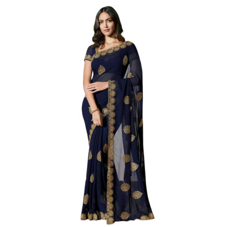 Indian Weightless Georgette Saree Blue Color - High-Quality Shari Embroidery Work On Blouse - Timeless Beauty Saree for Women