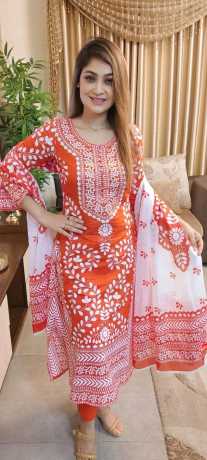 মহিলাদের জন্য আনস্টিচড উচ্চমানের সুতির ব্লক প্রিন্ট থ্রি পিস পোশাক