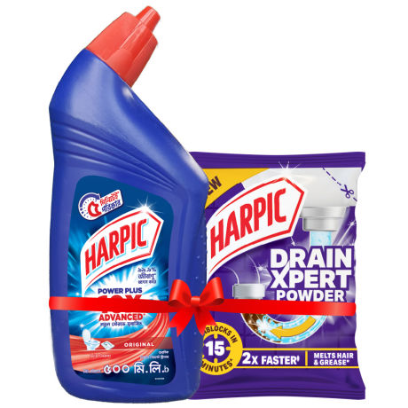 Harpic Toilet Cleaning Liquid Power Plus 10x Stronger 500ml + 45g Drain Cleaning Xpert Powder Combo Pack