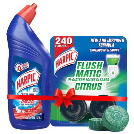 Harpic Toilet Cleaning Liquid Power Plus 10x Stronger 750ml + Flushmatic Citrus In Cistern Toilet Cleaner Blocks (50g x2) Combo