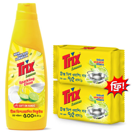 (Buy 1 Get 2 Free) Trix Dishwashing Liquid 500ml + Dishwashing Bar 2x75gm, Lemon Fragrance for Scratch-Free Sparkling Clean Dishes, removes grease stains with power-rich thick foam