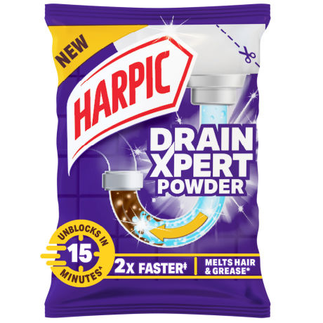 Harpic Drain Cleaning Xpert Powder 45g, Unblocks Clogged Bathroom, Kitchen & Shower Sink in 15 minutes, Clears Drainpipes, Melts Hair & Grease, Effective Sink and Drain Pipe Cleaner & Blockage Remover