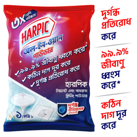 Harpic All-in-1 Toilet & Bathroom Cleaning Powder 1KG, 3X better cleaning compared to regular detergent, removes tough stains and dirt, Kills 99.9% germs, reduces bad smell.
