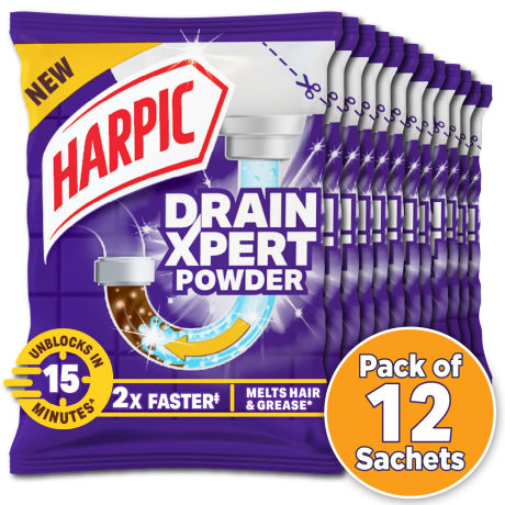 Harpic Drain Cleaning Xpert Powder 12pcs x 45g, Unblocks Clogged Bathroom, Kitchen & Shower Sink in 15 minutes, Clears Drainpipes, Melts Hair & Grease, Effective Sink and Drain Pipe Cleaner & Blockage Remover